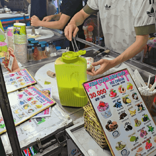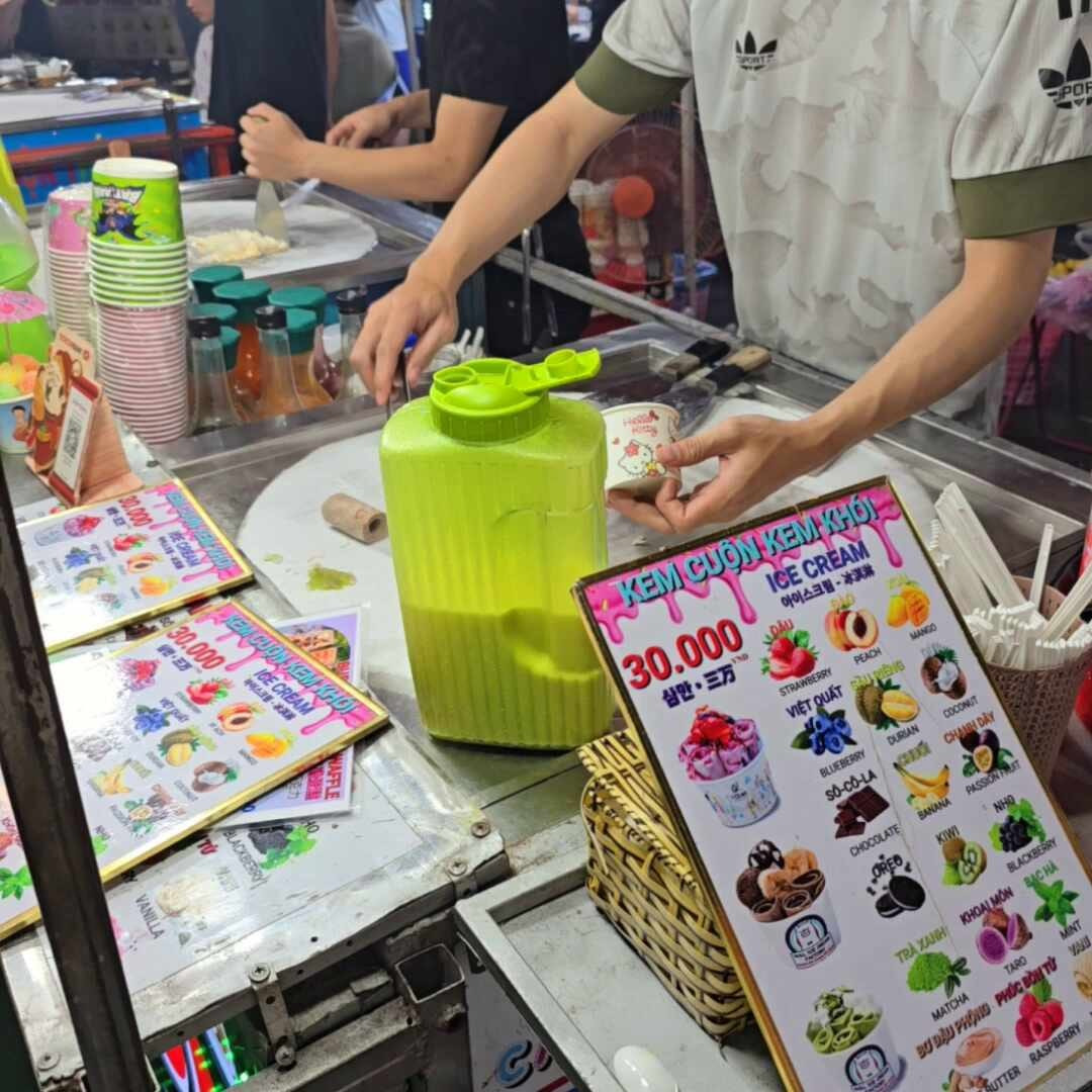 다양한 먹거리 스탠드가 즐비해 있어 즉석 요리를 맛볼 수 있어요. 철판 아이스크림과 같은 인기 먹거리는 그 자리에서 바로 만들어 주어 더 신선하고요, 가격도 약 30,000동(약 1,600원) 정도로 저렴해 가성비가 좋습니다.