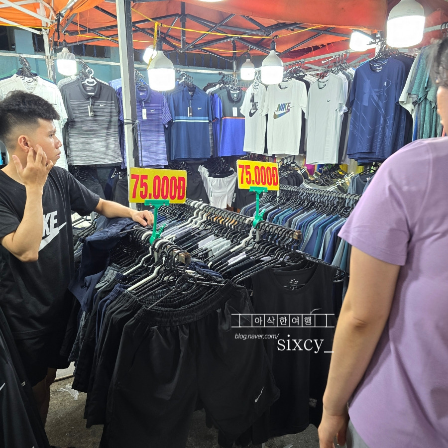 선짜 야시장은 의류부터 소품까지 가성비 좋은 아이템이 다양해요. 특히 한시장보다 옷값이 저렴하고, 여러 가지 패션 소품들이 정찰제로 판매되기 때문에 가격 흥정을 꺼리는 분들께는 더 부담 없이 쇼핑할 수 있는 장점이 있습니다. 예를 들어 티셔츠는 약 75,000동(약 4천 원)으로 저렴한 편이에요!